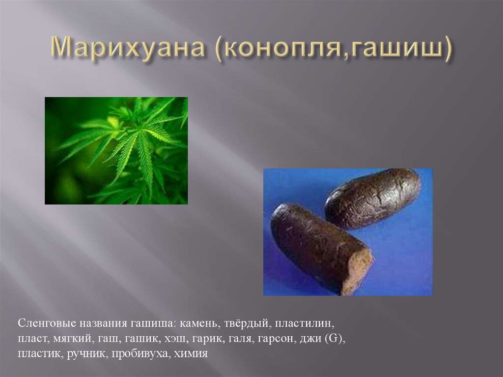 Сленговые названия гашиша: камень, твёрдый, пластилин,пласт, мягкий, гаш, гашик, хэш, гарик, галя, гарсон, джи (G),