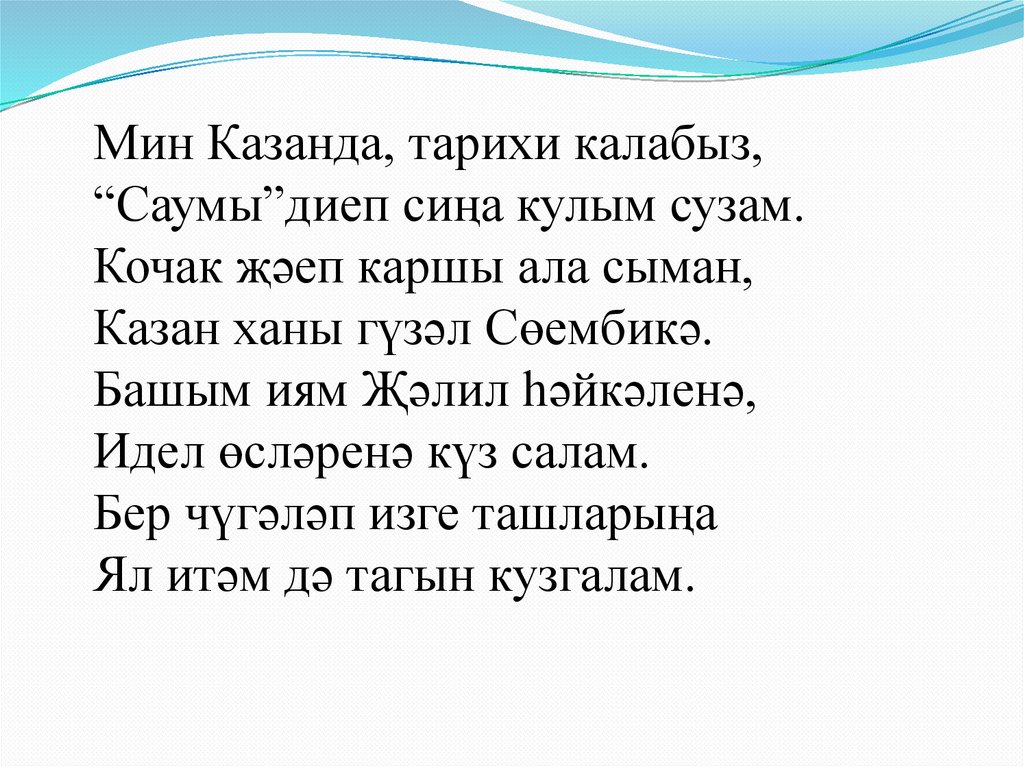 Мин Казанда, тарихи калабыз,“Саумы”диеп сиңа кулым сузам.