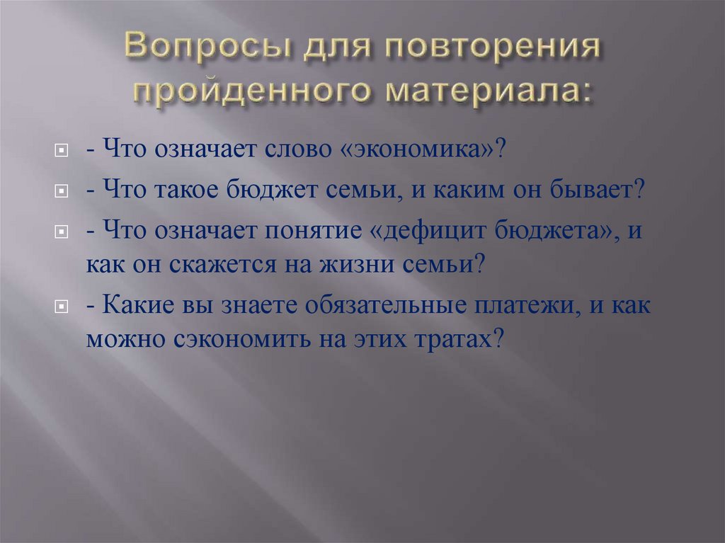 - Что означает слово «экономика»?- Что такое бюджет семьи, и каким он бывает?