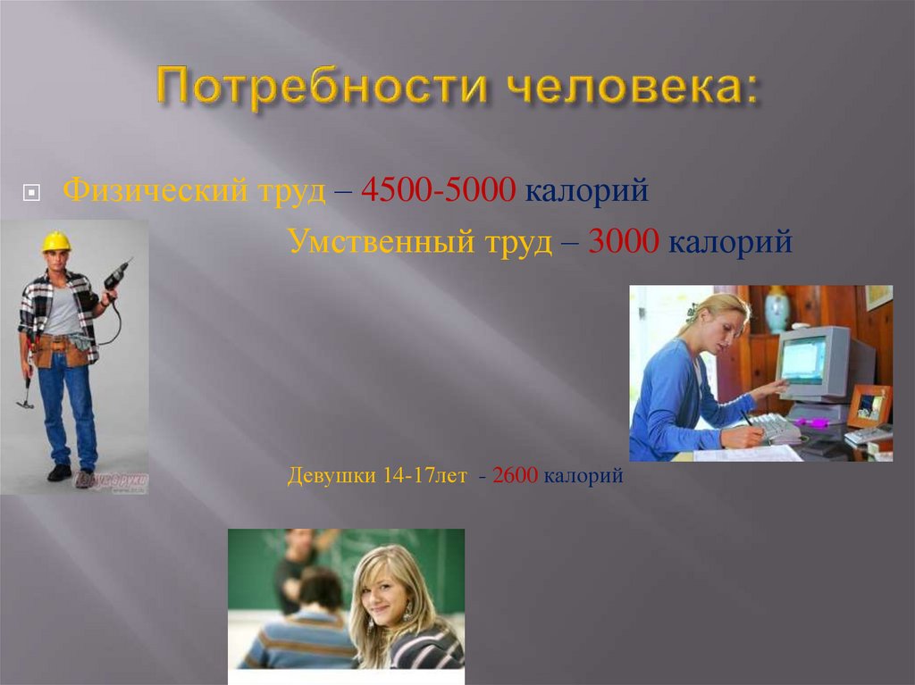Физический труд – 4500-5000 калорийУмственный труд – 3000 калорий