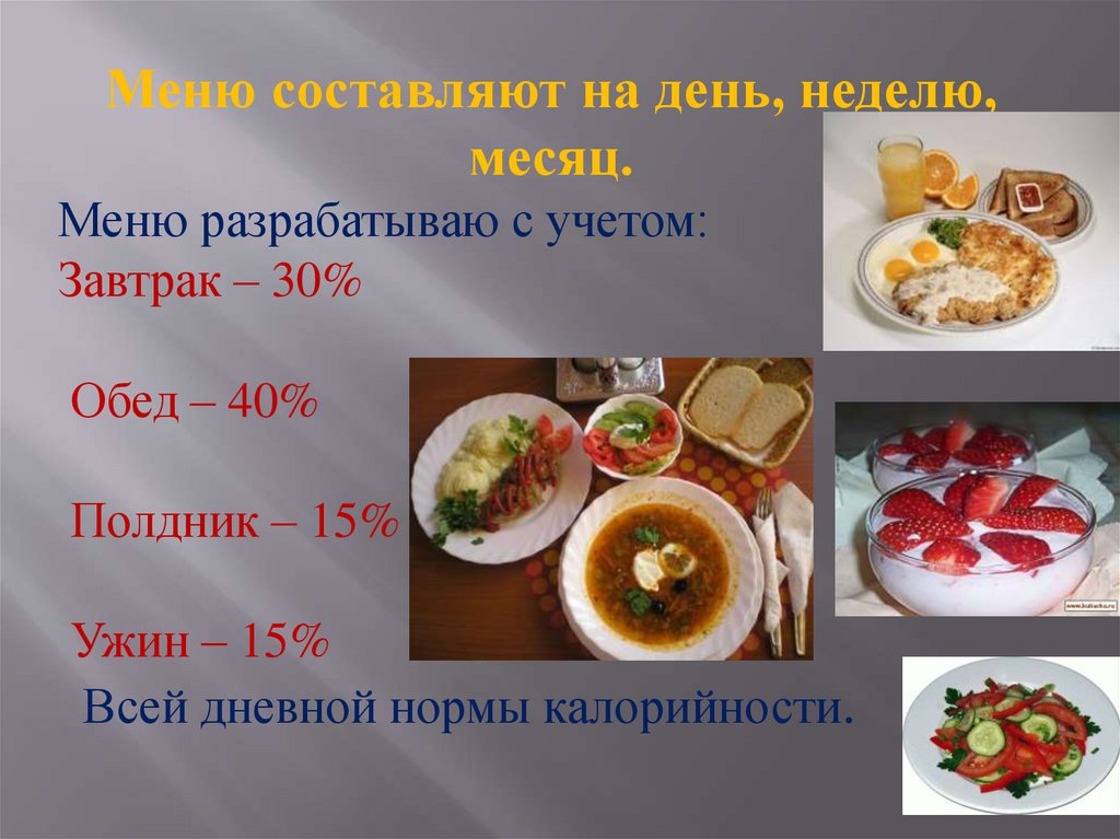 Меню составляют на день, неделю,месяц.