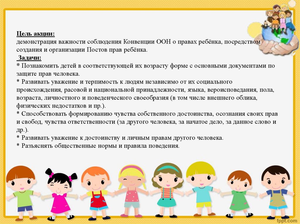 Цель акции:демонстрация важности соблюдения Конвенции ООН о правах ребёнка, посредством