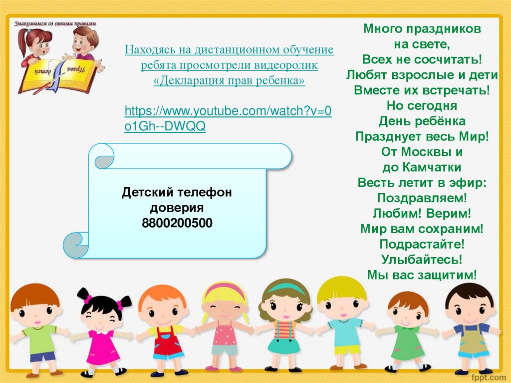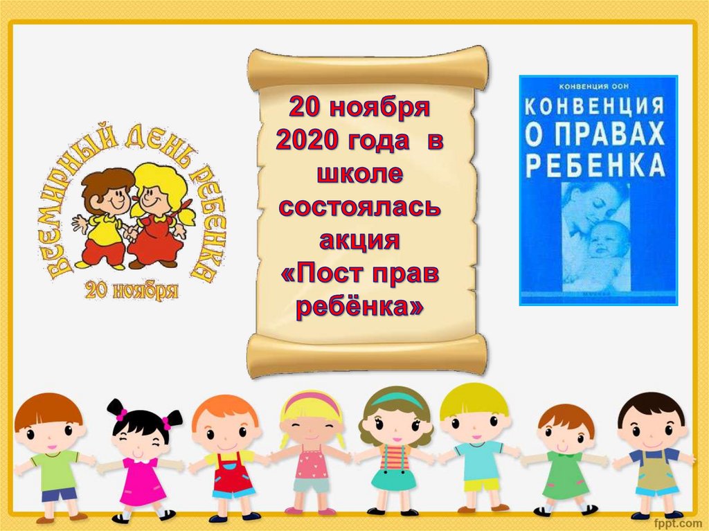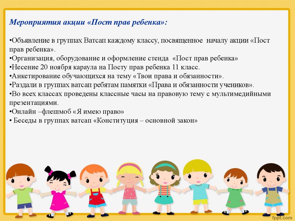 Мероприятия акции «Пост прав ребенка»:•Объявление в группах Ватсап каждому классу, посвященное началу акции «Пост