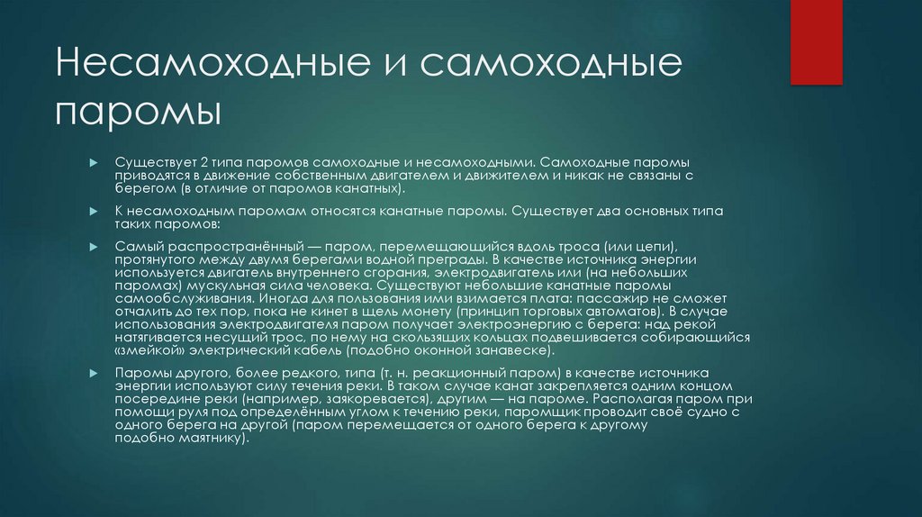 Существует 2 типа паромов самоходные и несамоходными. Самоходные паромы