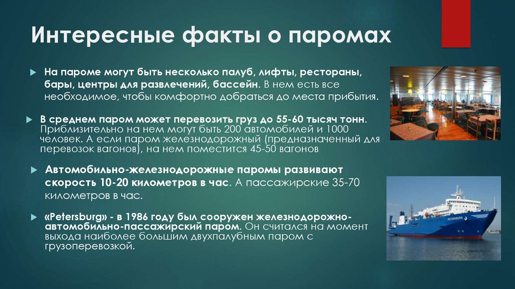 Интересные факты о паромахНа пароме могут быть несколько палуб, лифты, рестораны,
