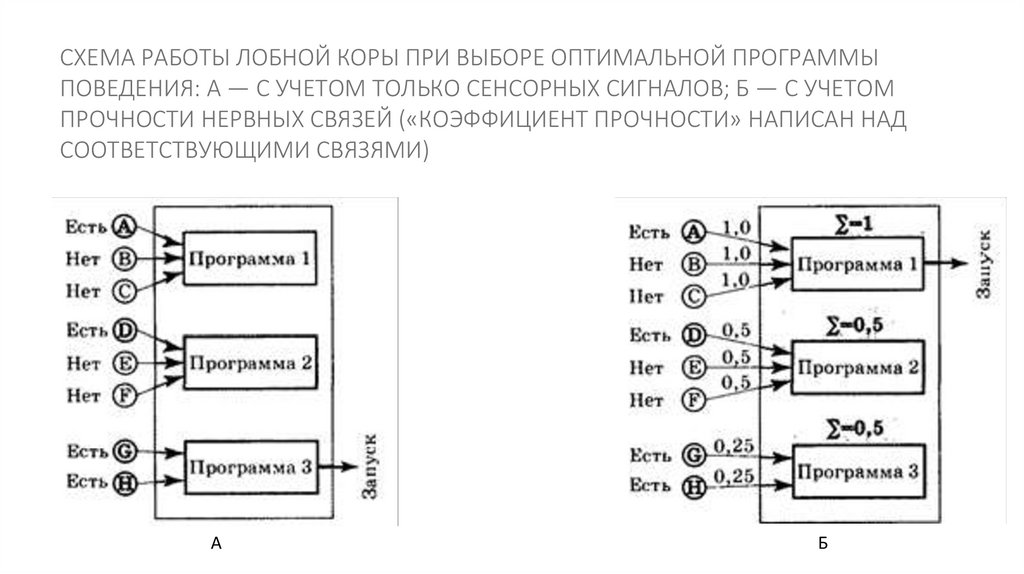 СХЕМА РАБОТЫ ЛОБНОЙ КОРЫ ПРИ ВЫБОРЕ ОПТИМАЛЬНОЙ ПРОГРАММЫПОВЕДЕНИЯ: А — С УЧЕТОМ ТОЛЬКО СЕНСОРНЫХ СИГНАЛОВ; Б — С УЧЕТОМ