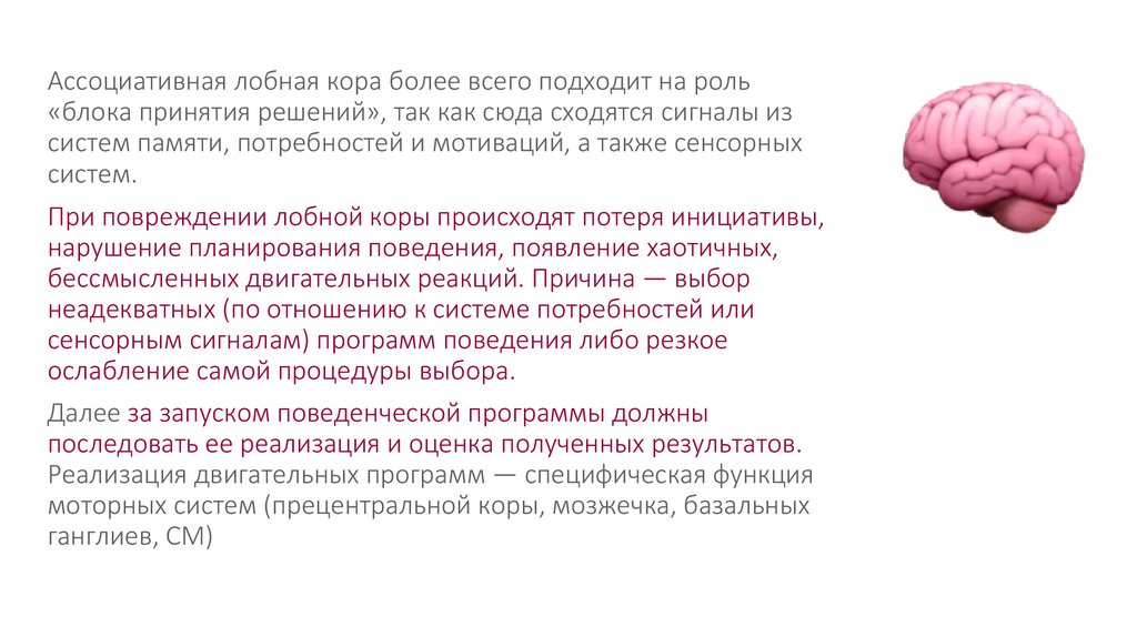 Ассоциативная лобная кора более всего подходит на роль«блока принятия решений», так как сюда сходятся сигналы из
