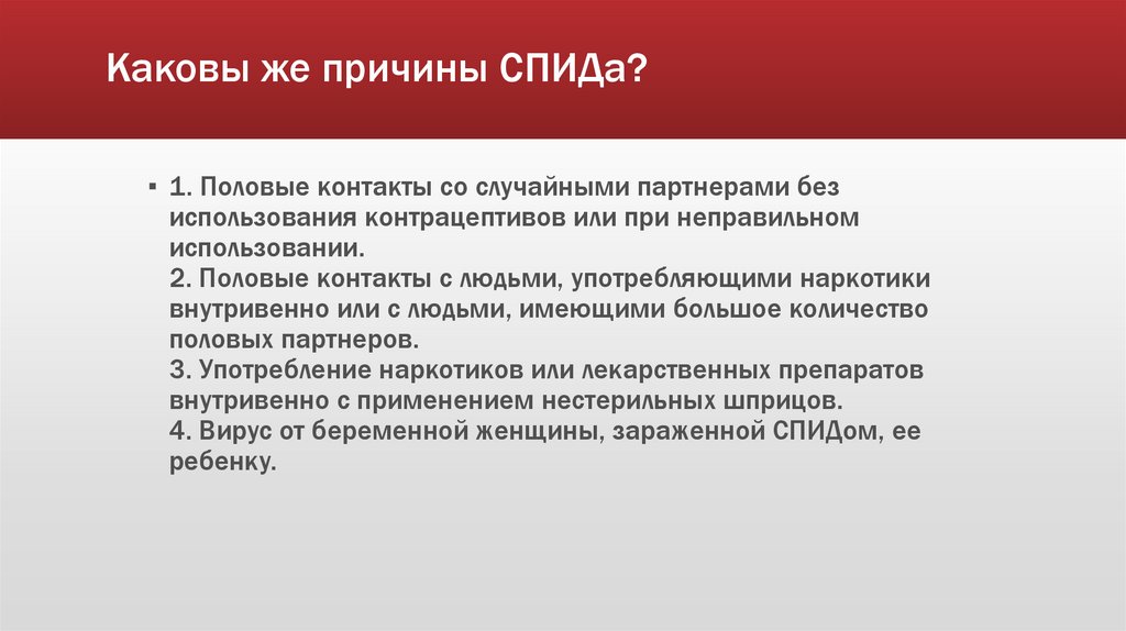 Каковы же причины СПИДа?▪ 1. Половые контакты со случайными партнерами без