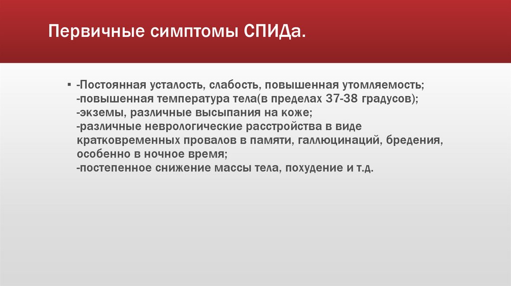 Первичные симптомы СПИДа.▪ -Постоянная усталость, слабость, повышенная утомляемость;