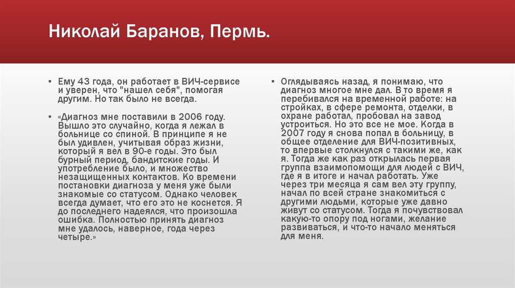 Николай Баранов, Пермь.▪ Ему 43 года, он работает в ВИЧ-сервисе
