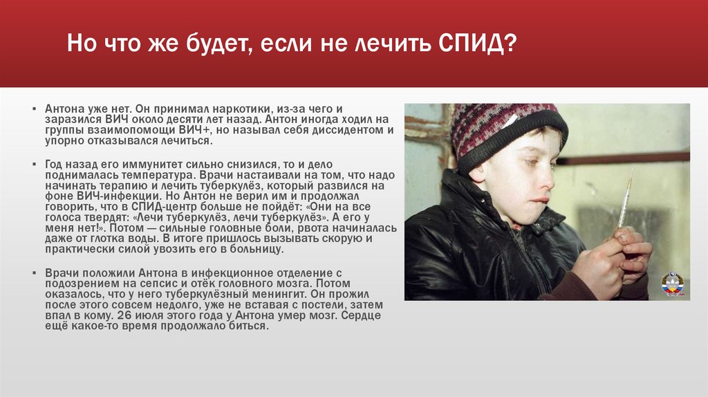 Но что же будет, если не лечить СПИД?▪ Антона уже нет. Он принимал наркотики, из-за чего и