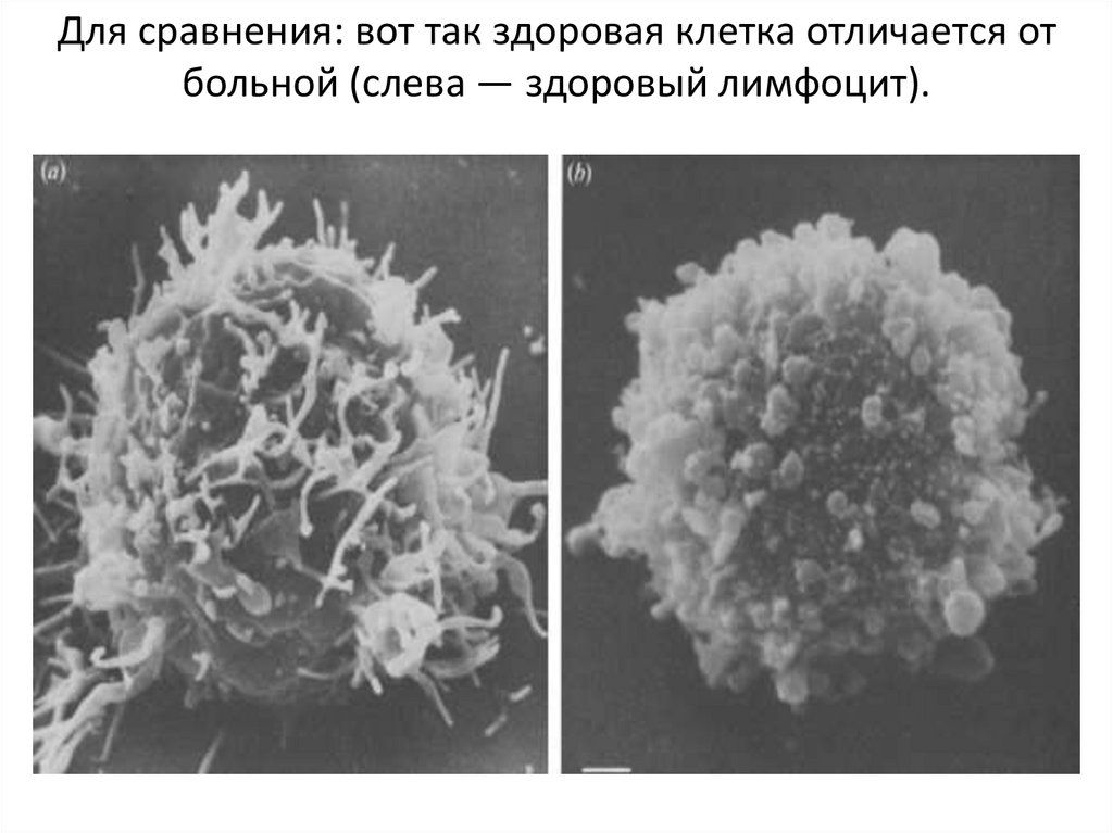 Для сравнения: вот так здоровая клетка отличается отбольной (слева — здоровый лимфоцит).