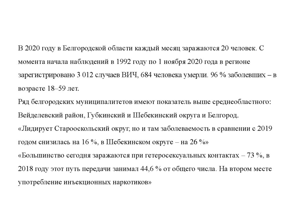 В 2020 году в Белгородской области каждый месяц заражаются 20 человек. Смомента начала наблюдений в 1992 году по 1 ноября 2020 года в регионе