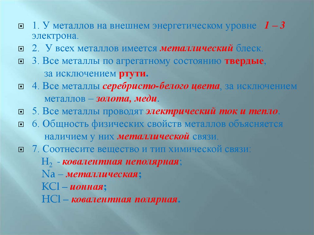 1. У металлов на внешнем энергетическом уровне 1 – 3электрона.