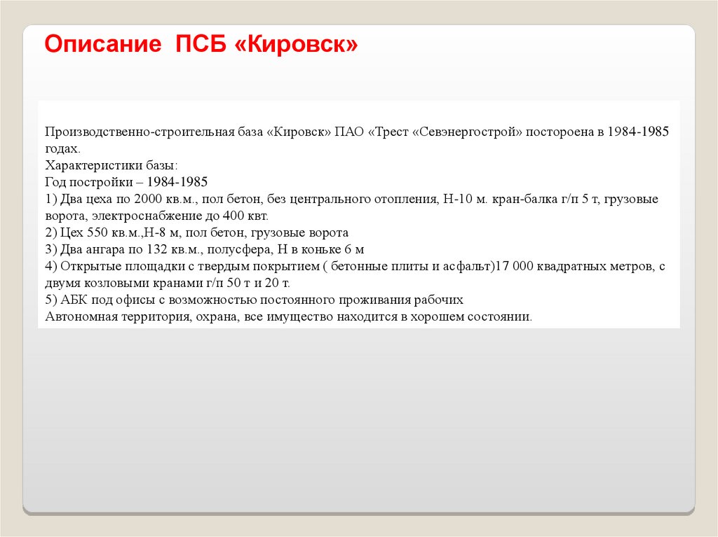 Описание ПСБ «Кировск»Производственно-строительная база «Кировск» ПАО «Трест «Севэнергострой» постороена в 1984-1985