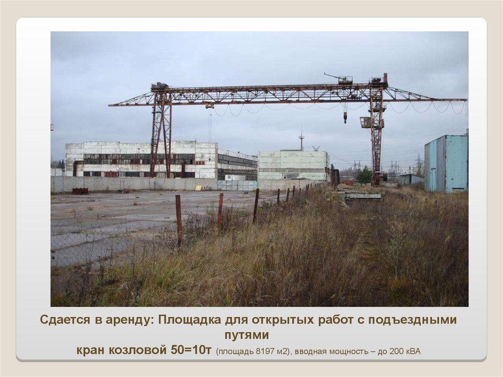 кран козловой 50=10т (площадь 8197 м2), вводная мощность – до 200 кВА