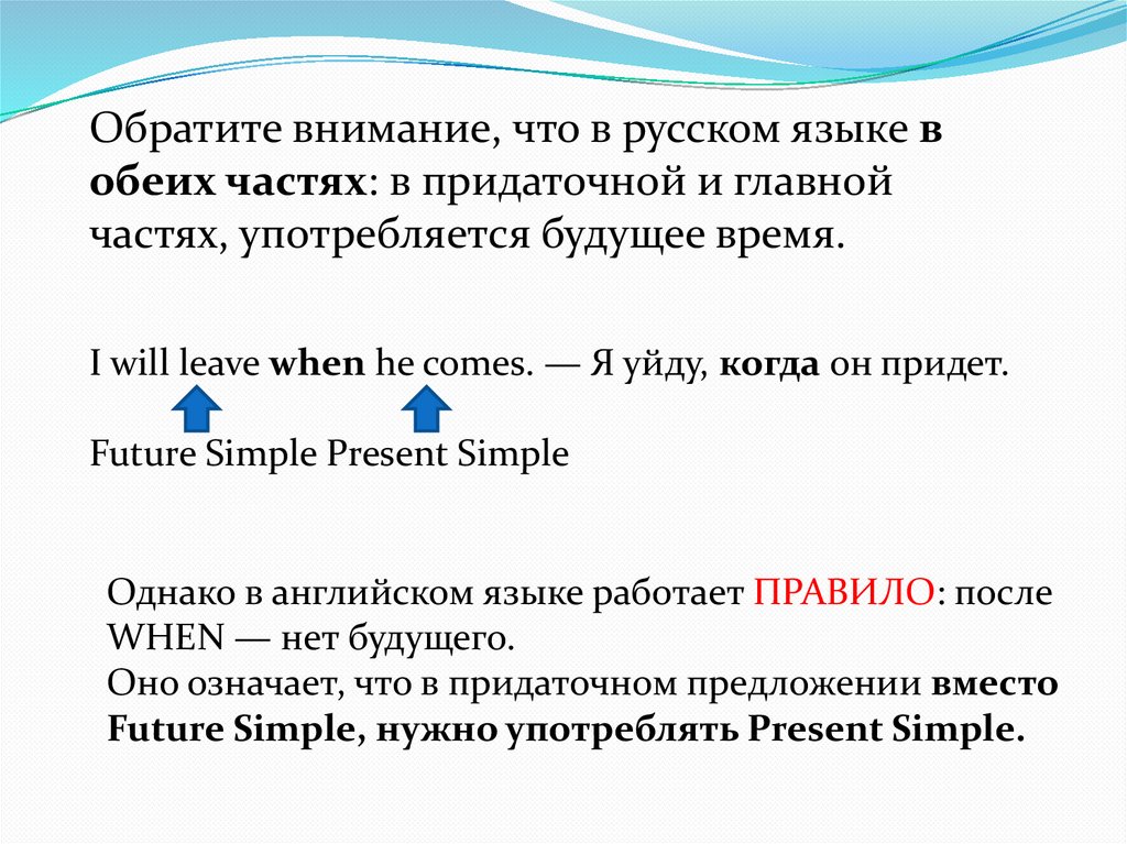 Обратите внимание, что в русском языке вобеих частях: в придаточной и главной