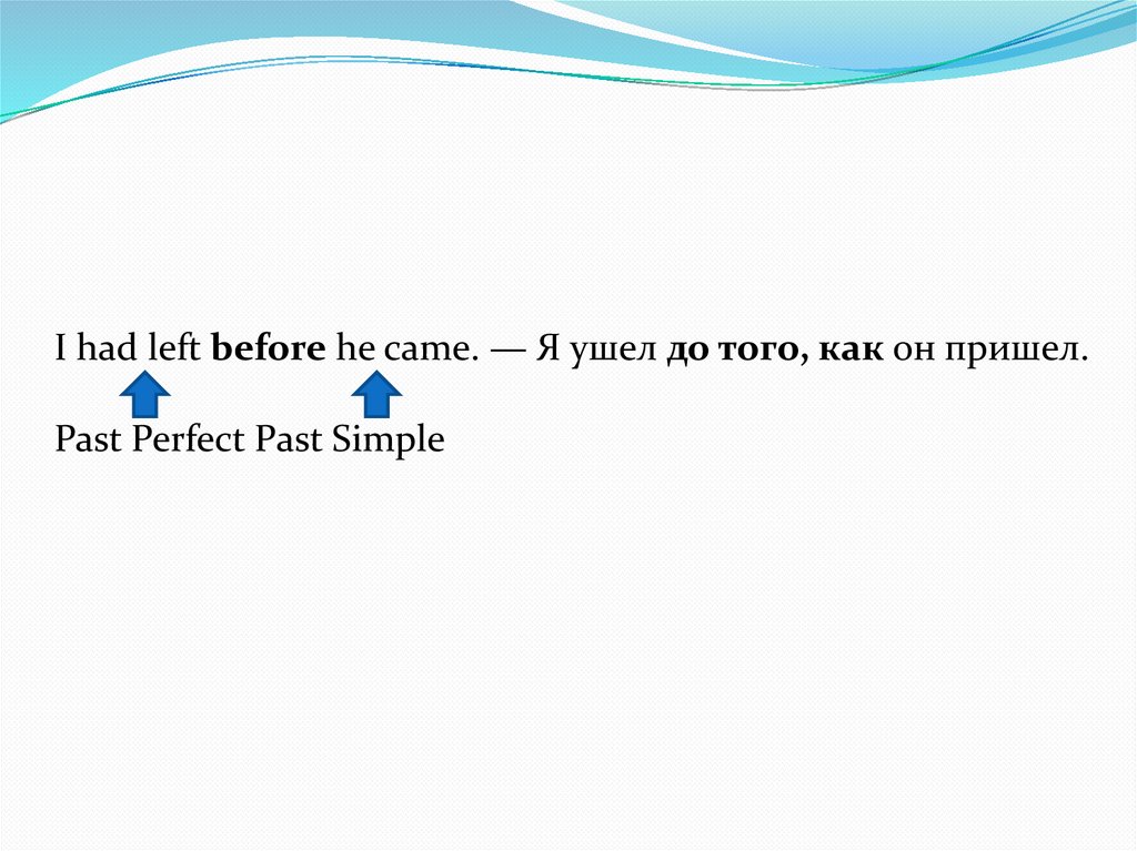 I had left before he came. — Я ушел до того, как он пришел.Past Perfect Past Simple