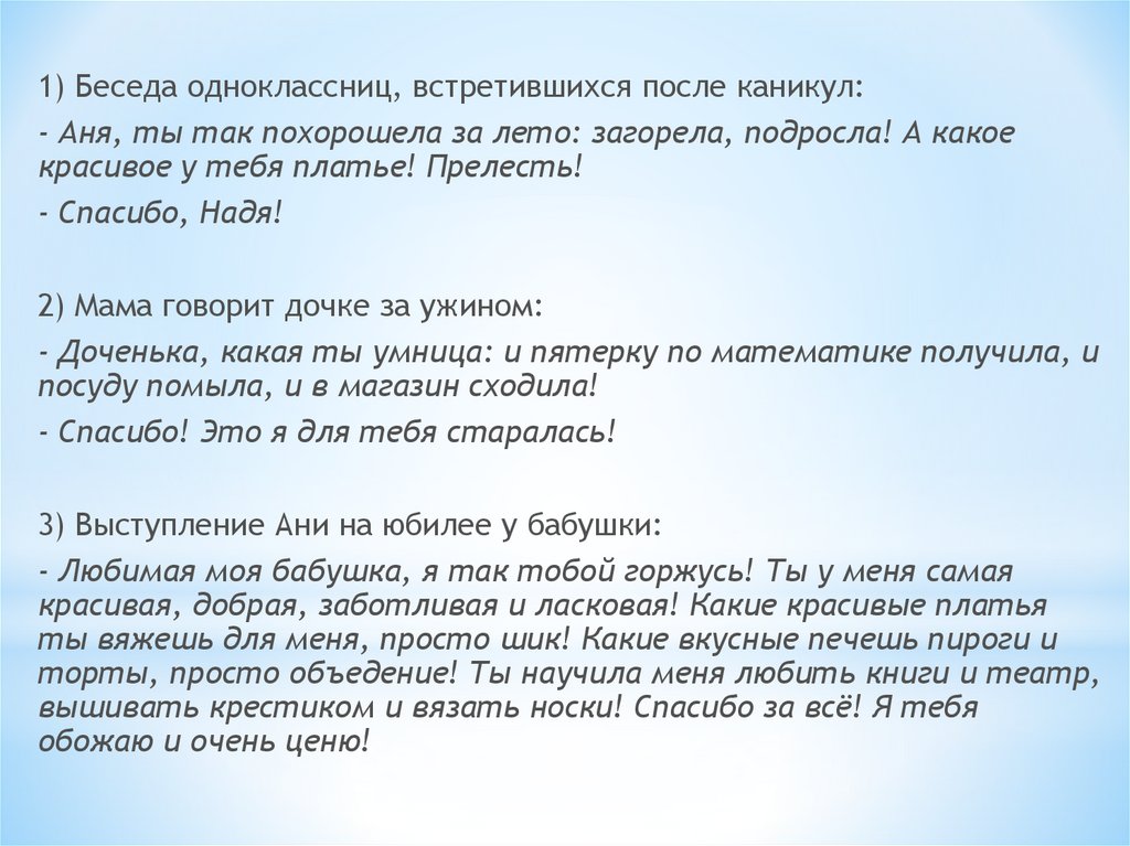 1) Беседа одноклассниц, встретившихся после каникул:- Аня, ты так похорошела за лето: загорела, подросла! А какое