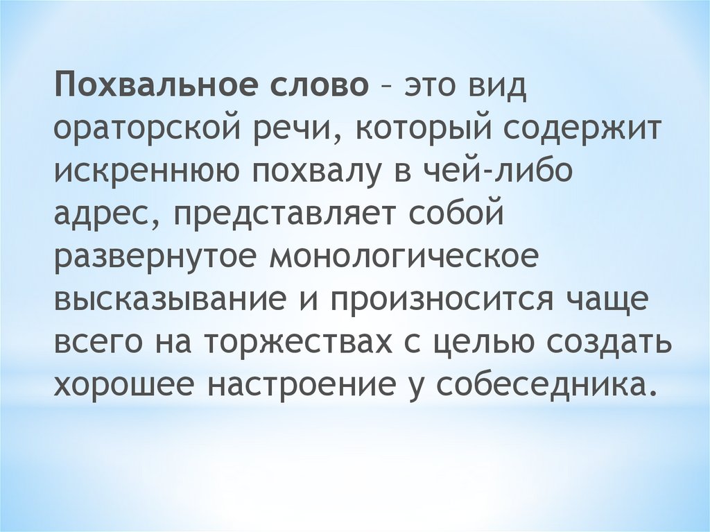 Похвальное слово – это видораторской речи, который содержит