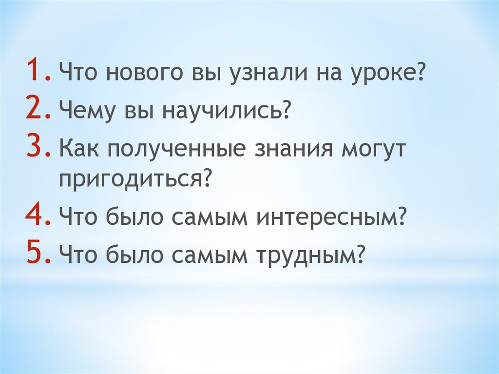 1. Что нового вы узнали на уроке?2. Чему вы научились?
