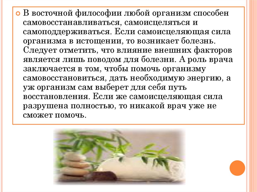 В восточной философии любой организм способенсамовосстанавливаться, самоисцеляться и