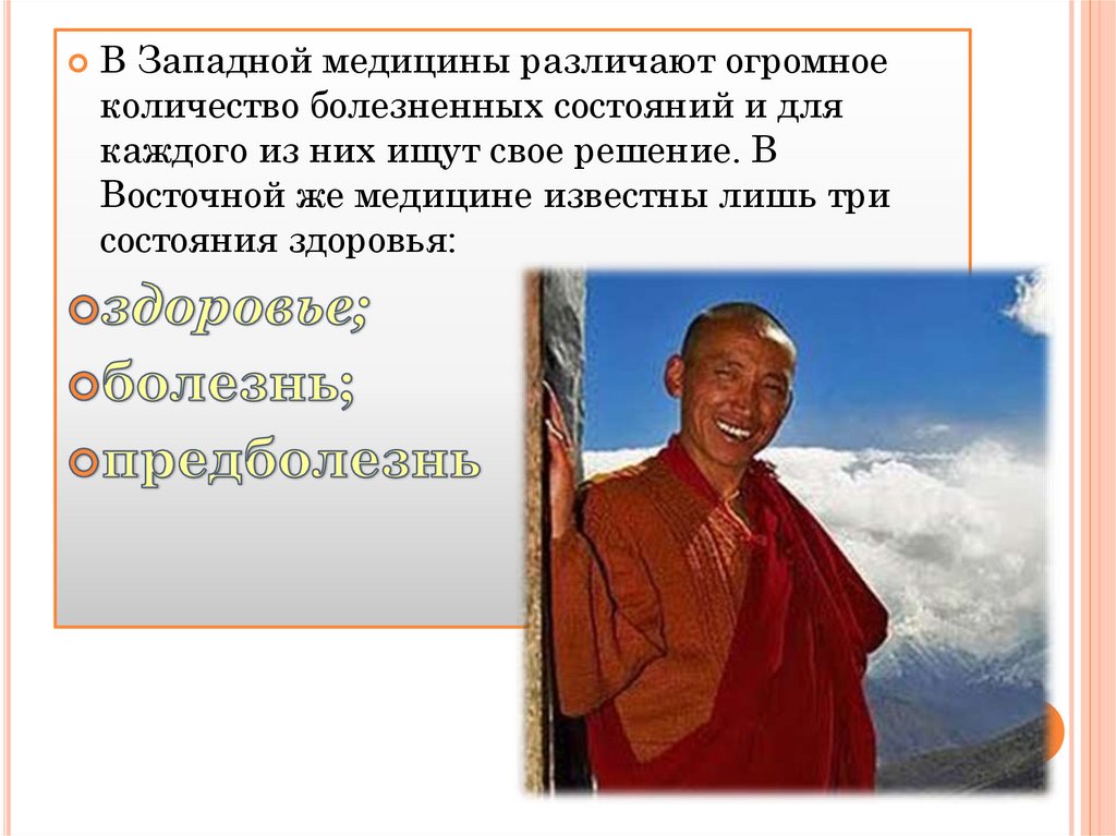 В Западной медицины различают огромноеколичество болезненных состояний и для