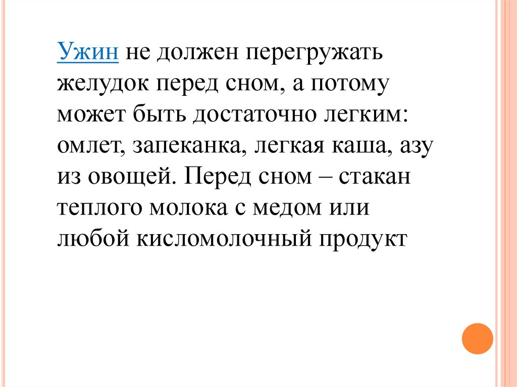 Ужин не должен перегружатьжелудок перед сном, а потому
