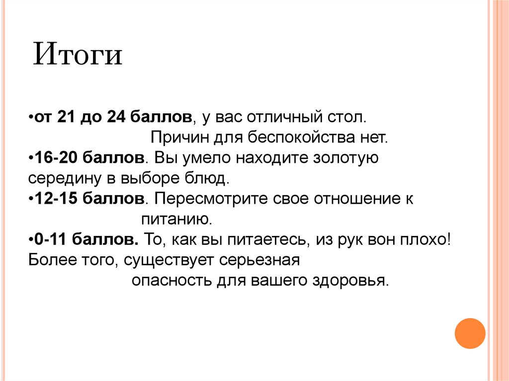 Итоги•от 21 до 24 баллов, у вас отличный стол.