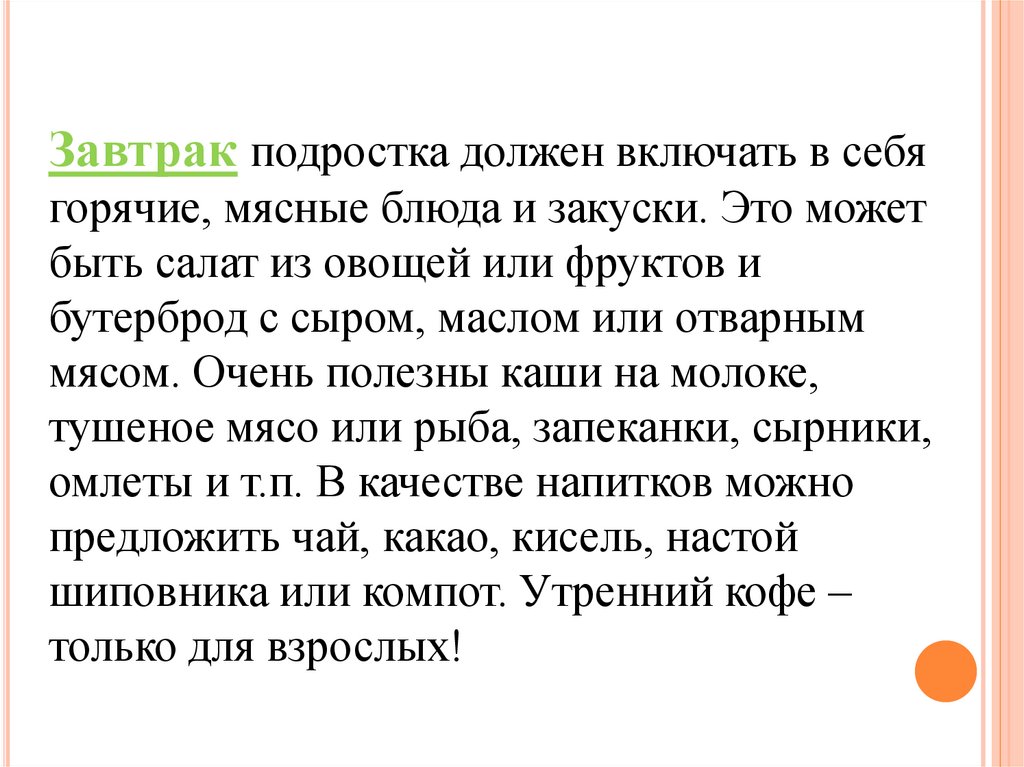 Завтрак подростка должен включать в себягорячие, мясные блюда и закуски. Это может