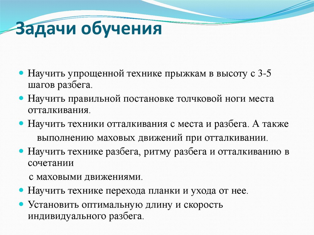 Научить технике разбега, ритму разбега и отталкиванию в