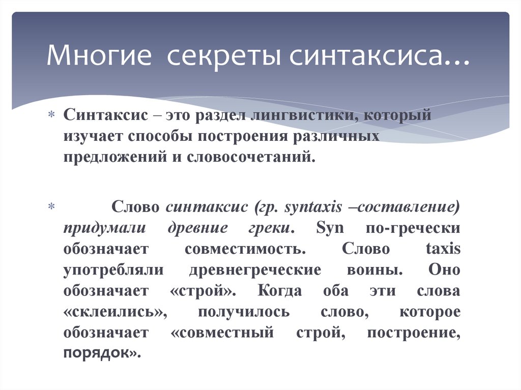 Многие секреты синтаксиса…Синтаксис – это раздел лингвистики, который