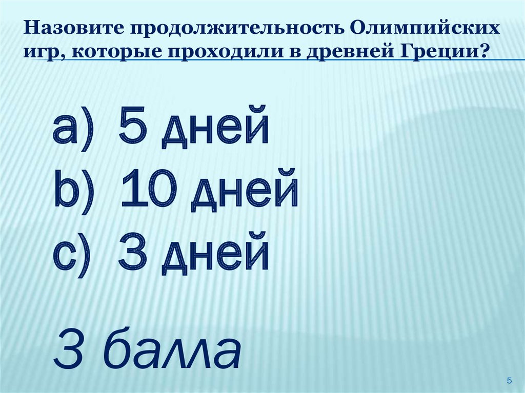 Назовите продолжительность Олимпийскихигр, которые проходили в древней Греции?