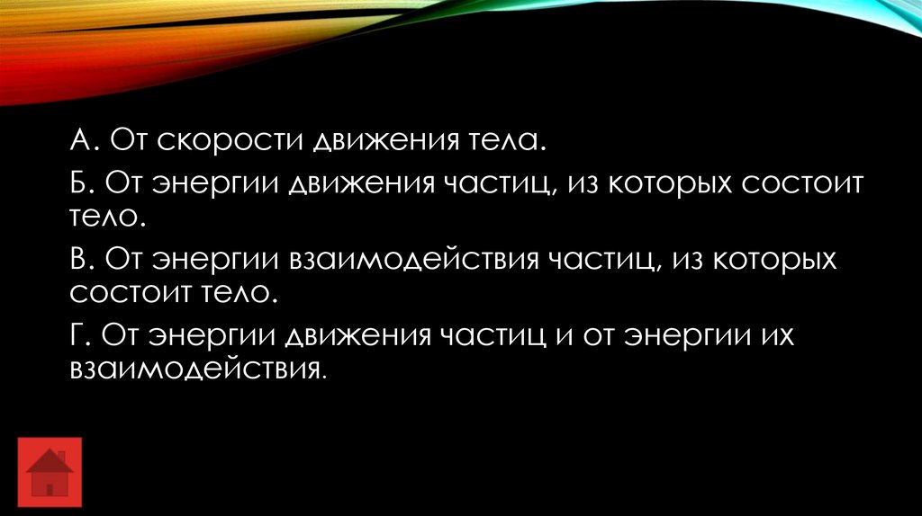 А. От скорости движения тела.Б. От энергии движения частиц, из которых состоит