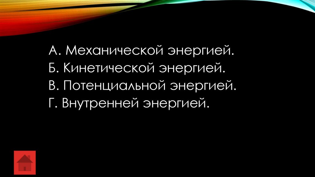 A. Механической энергией.Б. Кинетической энергией.
