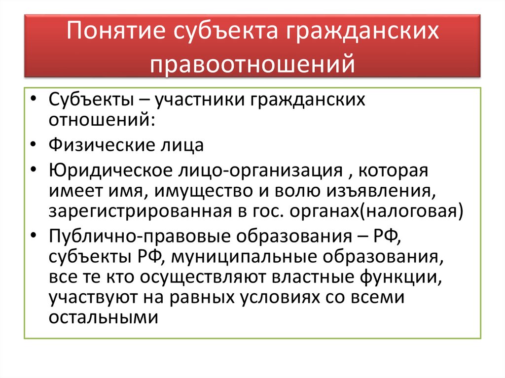 • Субъекты – участники гражданских