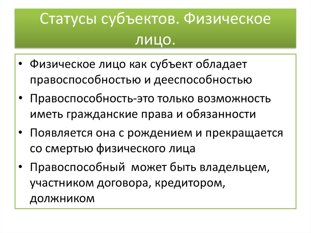 • Физическое лицо как субъект обладает