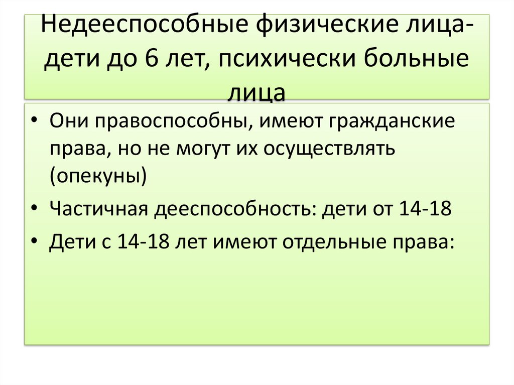 Недееспособные физические лицадети до 6 лет, психически больныелица