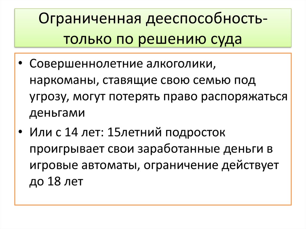 Ограниченная дееспособностьтолько по решению суда• Совершеннолетние алкоголики,