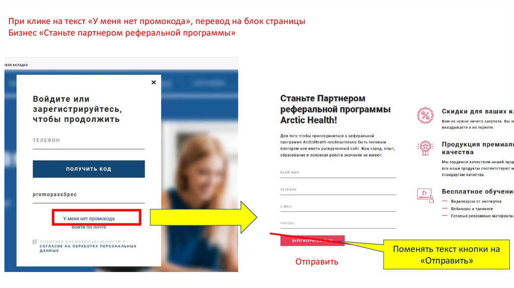 При клике на текст «У меня нет промокода», перевод на блок страницы