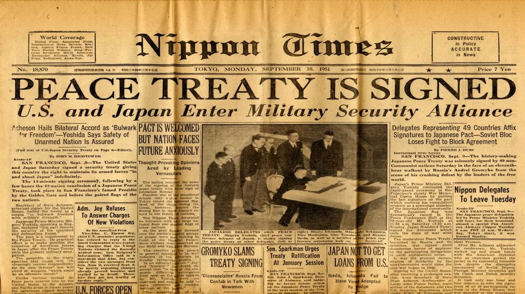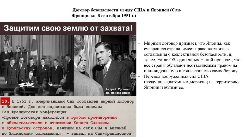 Договор безопасности между США и Японией (СанФранциско, 8 сентября 1951 г.)• Мирный договор признает, что Япония, как