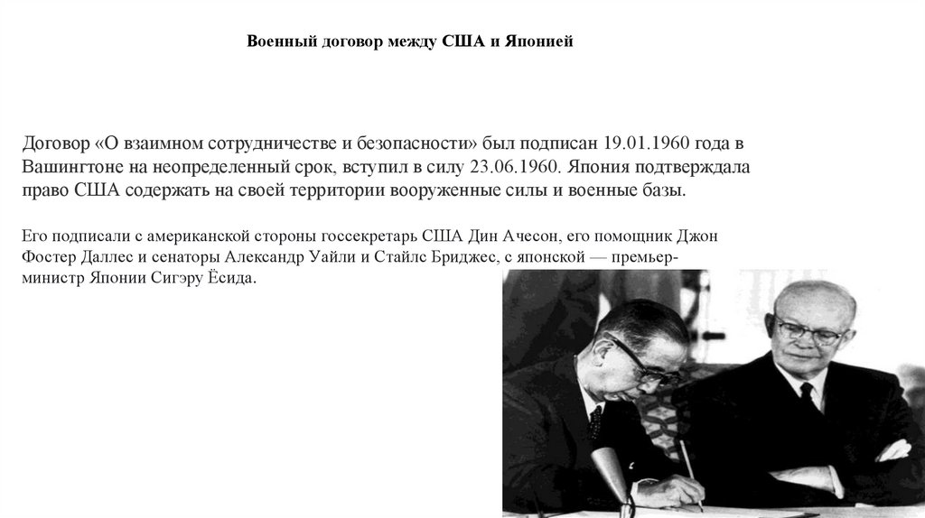 Военный договор между США и ЯпониейДоговор «О взаимном сотрудничестве и безопасности» был подписан 19.01.1960 года в