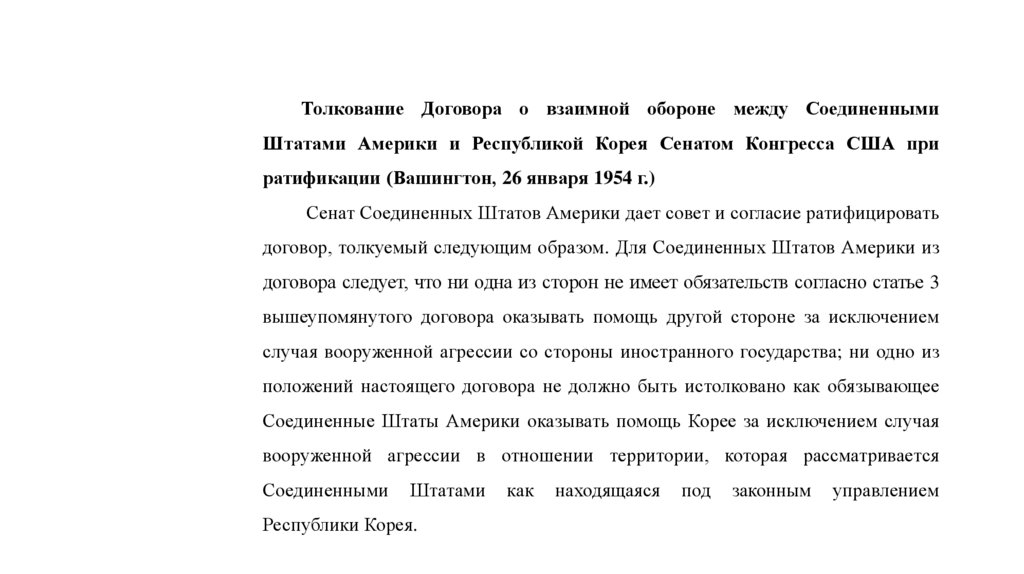 Толкование Договора о взаимной обороне между СоединеннымиШтатами Америки и Республикой Корея Сенатом Конгресса США при