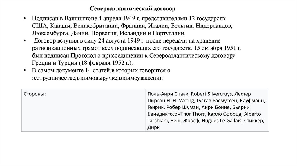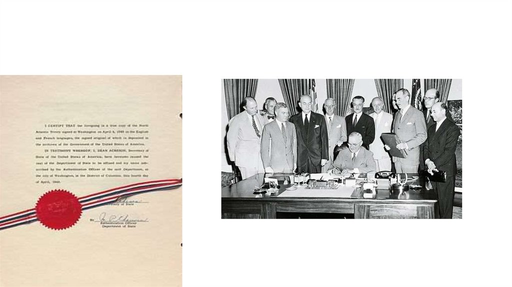 Североатлантический договор• Подписан в Вашингтоне 4 апреля 1949 г. представителями 12 государств: