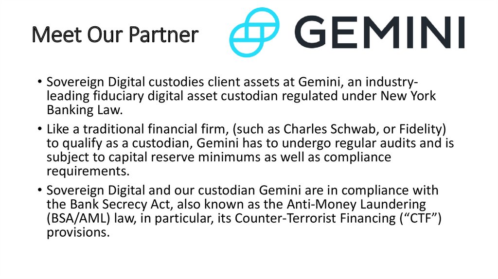 Meet Our Partner• Sovereign Digital custodies client assets at Gemini, an industryleading fiduciary digital asset custodian regulated under New York