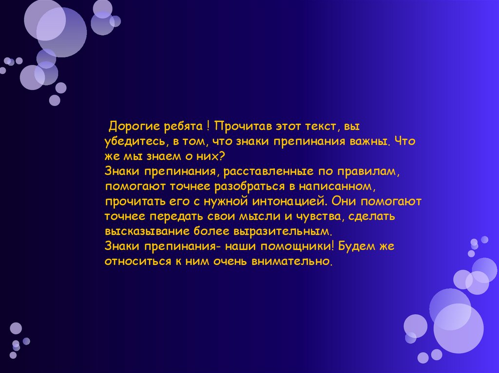 Дорогие ребята ! Прочитав этот текст, выубедитесь, в том, что знаки препинания важны. Что