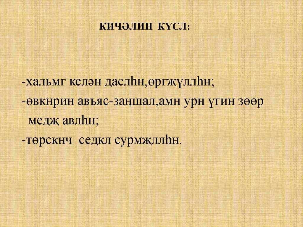 КИЧӘЛИН КҮСЛ:-хальмг келән даслһн,өргҗүллһн;