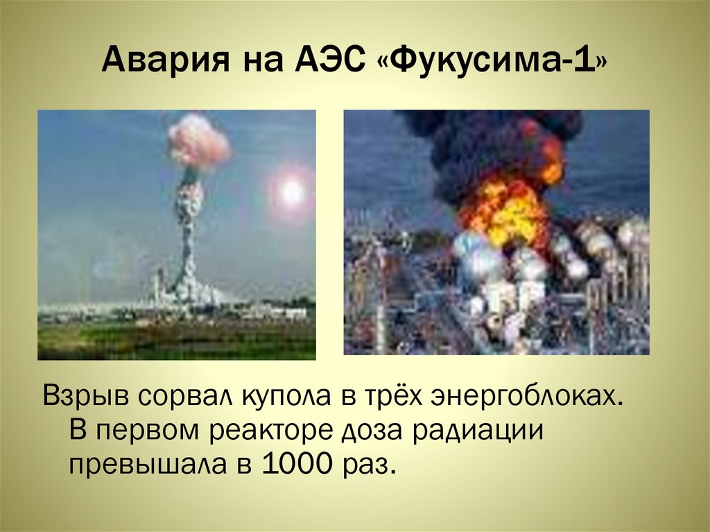 Авария на АЭС «Фукусима-1»Взрыв сорвал купола в трёх энергоблоках.