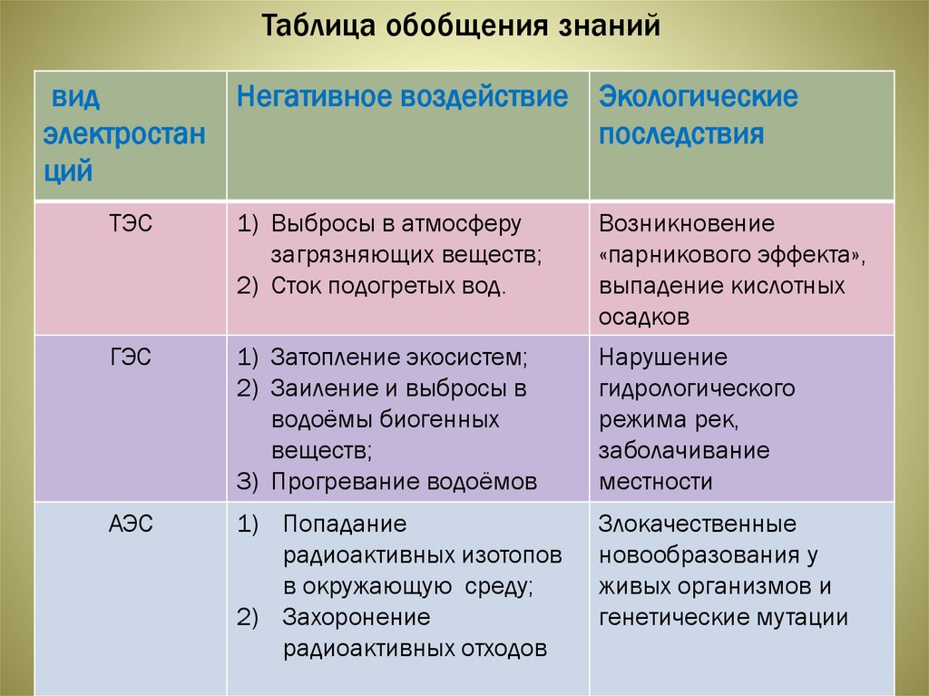 Таблица обобщения знанийвид