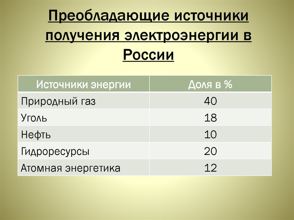 Преобладающие источникиполучения электроэнергии в